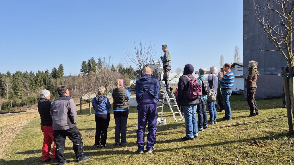 Nachdem im Herbst 2025 über 800 junge Obstbäume im Rahmen der Streuobstaktion ausgegeben wurden, fanden Anfang März für die Teilnehmer*innen der Streuobstaktion nun zwei Schnittkurse statt. Das regionale Biotopverbund-Management richtete gemeinsam mit der Naturschutz Akademie Steiermark je einen Kurstag in St. Stefan ob Stainz und in Gamlitz aus. Stefan Tschiggerl von den steirischen Obstbaumwärter*innen führte die Kursteilnehmer*innen zu Beginn durch einen theoretischen Teil, in dem unter anderem das richtige Werkzeug, Kronenformen, Schnittzeitpunkte und die Physiologie der Obstbäume thematisiert wurden. Schritt für Schritt ging es dann praxisnah an den fachgerechten Schnitt von jungen Obstbäumen. Unter der fachlichen Anleitung war die Hemmung vor dem ersten eigenen Schnitt schnell weggeblasen und die Teilnehmer*innen legten selbst Hand an.
