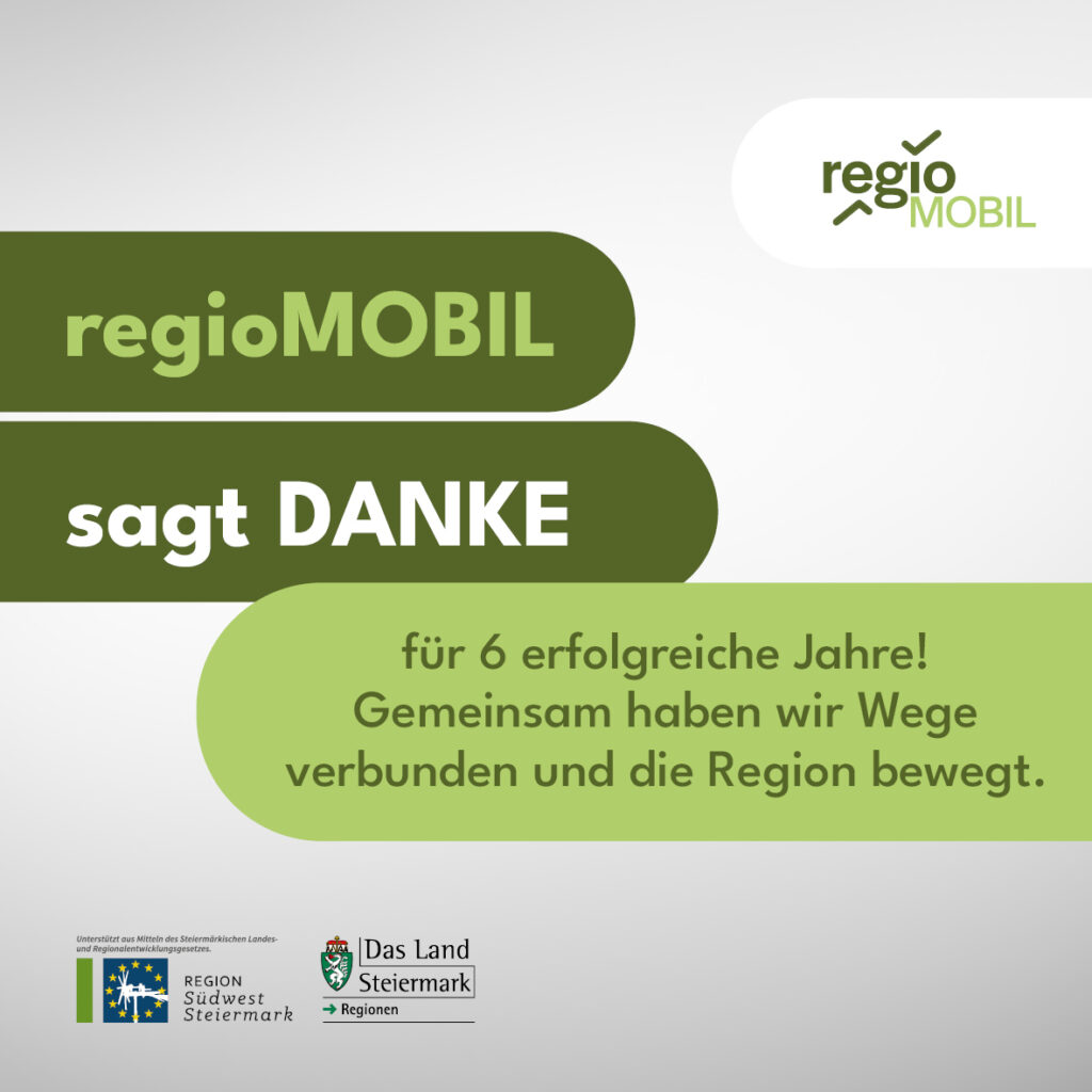 Das beliebte Anrufsammeltaxi regioMOBIL wird nach vielen erfolgreichen Jahren am 31. März 2026 eingestellt. Es war eines der erfolgreichsten Mikro-ÖV-Systeme in Österreich und bot vielen Menschen in der Region Südweststeiermark flexible und umweltfreundliche Mobilität. 2020 bis 2026 wurden mit regioMOBIL rund 260.000 Personen transportiert. Mit dem touristischen System WEINmobil konnte diese Zahl fast verdoppelt werden.
