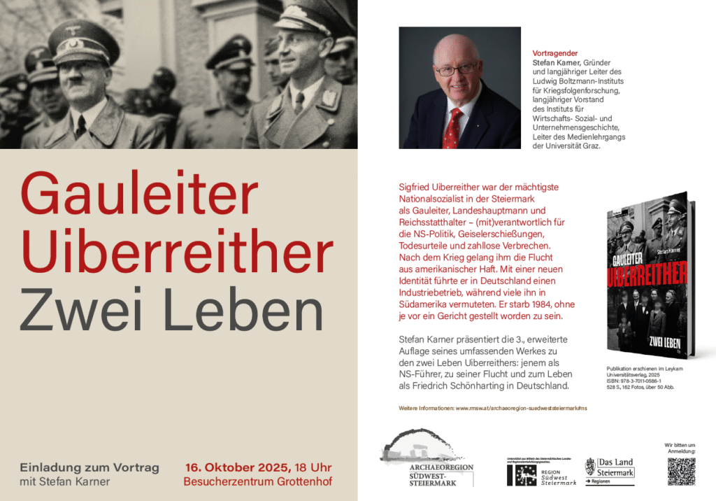 Am 16.10.2025 um 18 Uhr findet im Besucherzentrum Grottenhof die Buchpräsentation des Werkes „Gauleiter Uiberreither: Zwei Leben“ von Univ.-Prof. Dr. Dr. h.c. Stefan Karner statt.